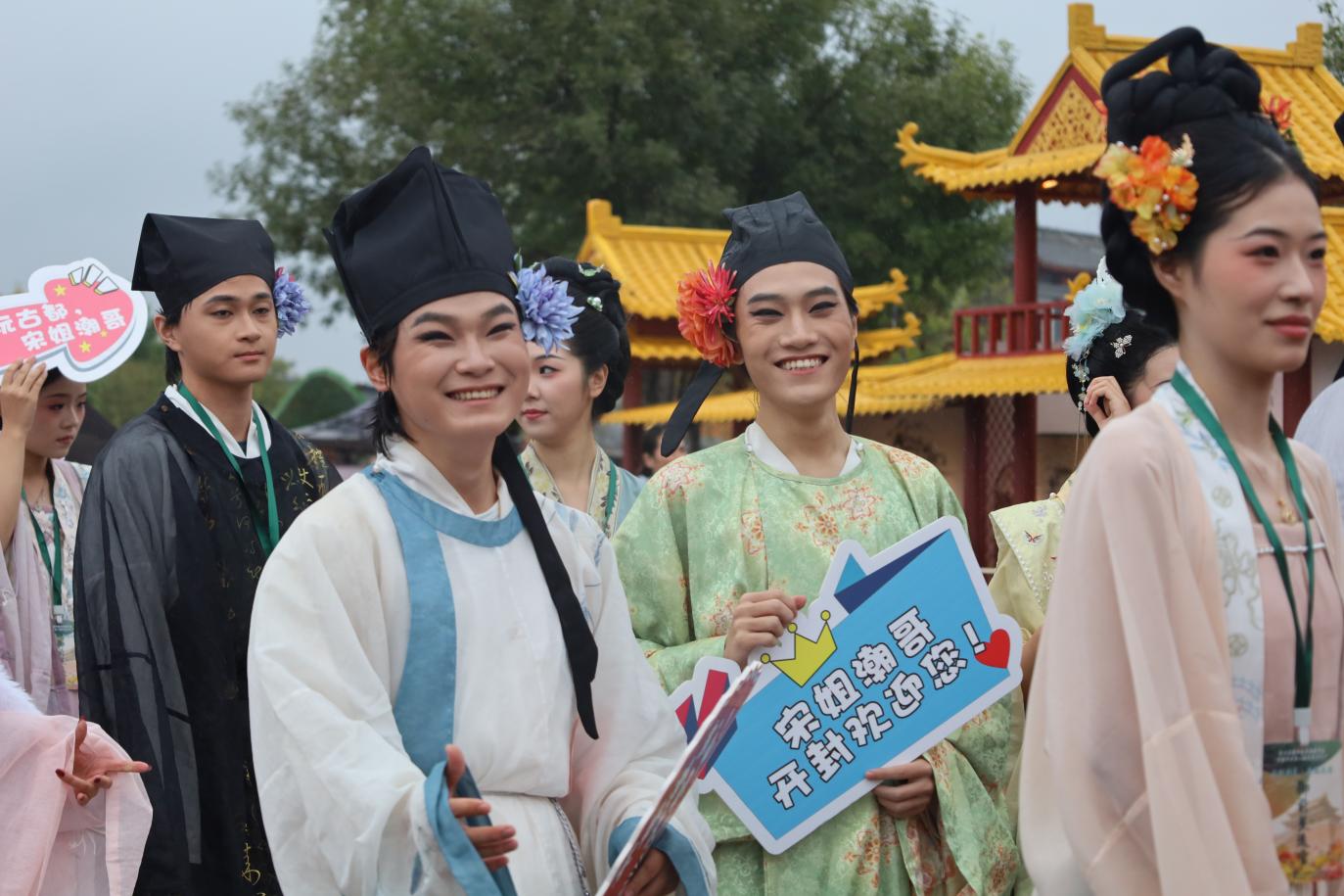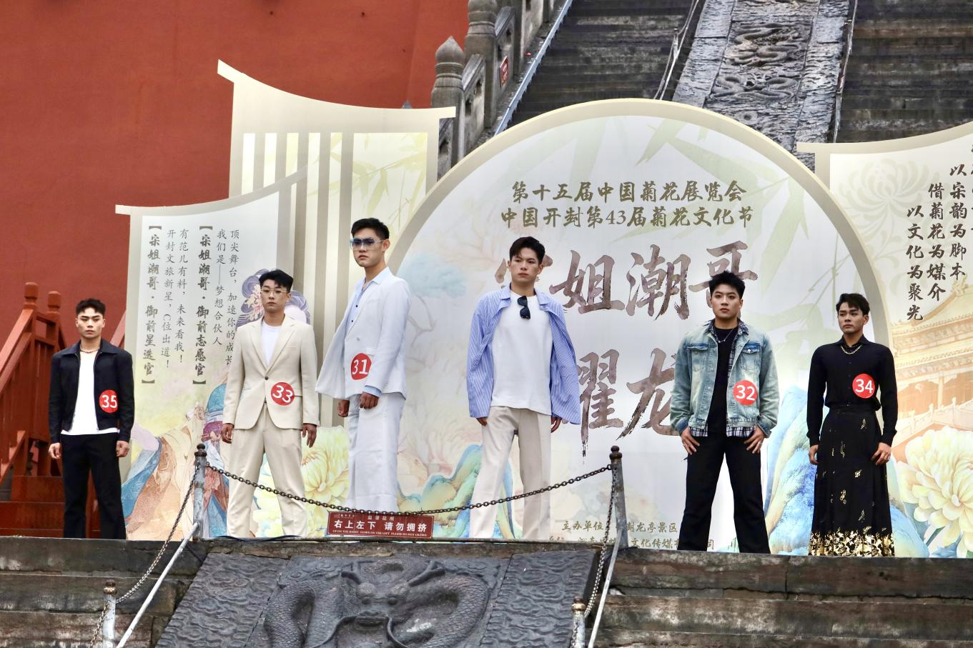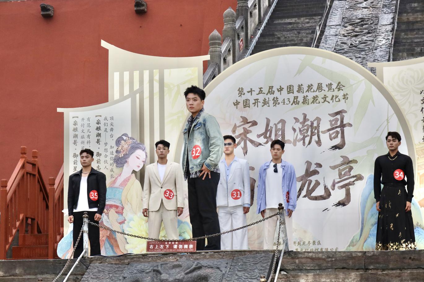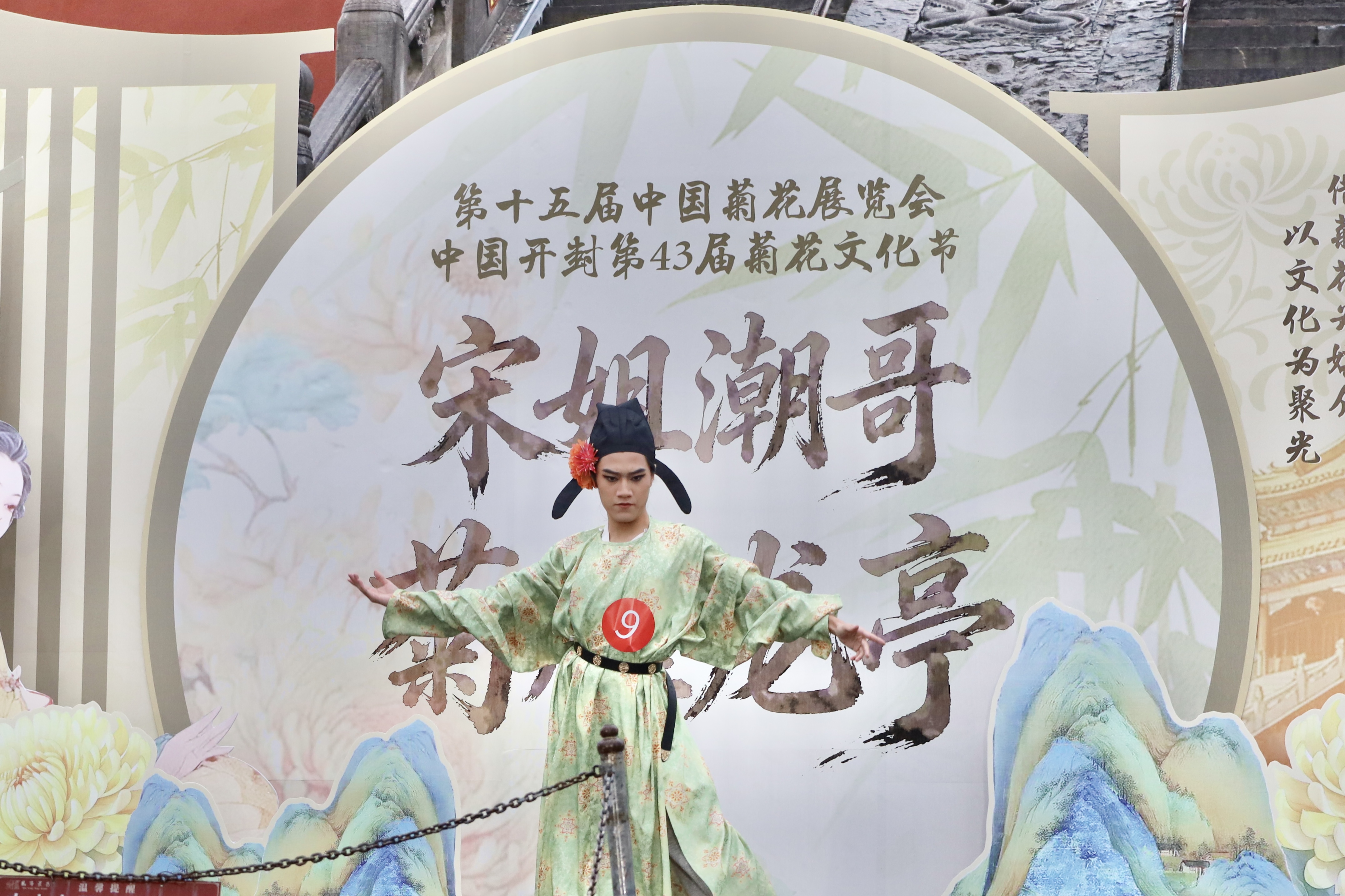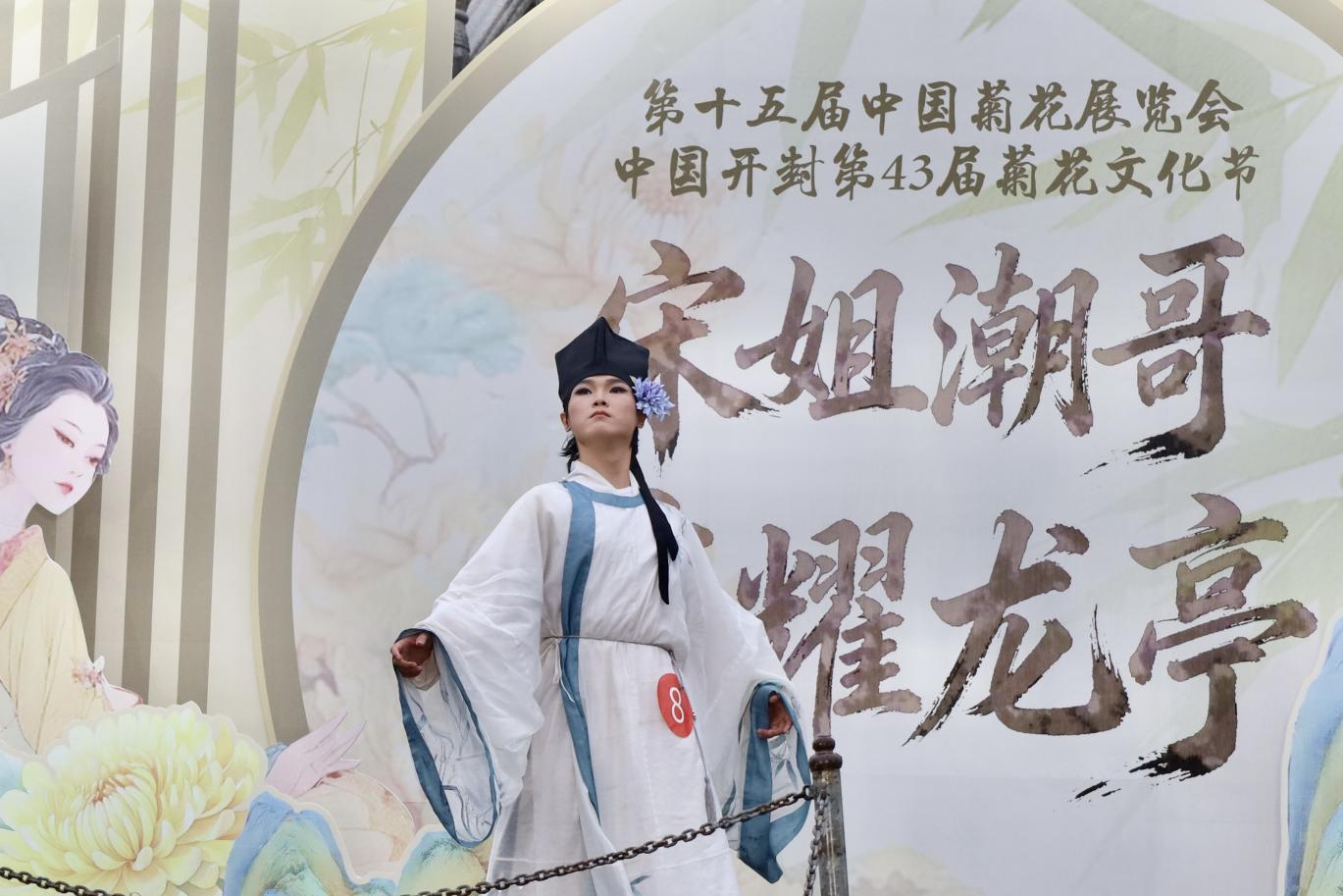 本次赛事作为以“宋韵开封,菊香中国”为主题的节会核心活动之一,不仅是文化展示的舞台,更是传统与时尚碰撞的盛会。活动伊始,包括我院学子在内的全体参赛人员与龙亭景区演员、NPC及开封各大景区NPC代表共同开展巡游互动,衣袂飘飘的宋风巡游队伍与满园秋菊相映成趣,再现了“东京真是富贵迷人眼”的盛景意境,为现场观众打造了沉浸式的宋韵文化体验。