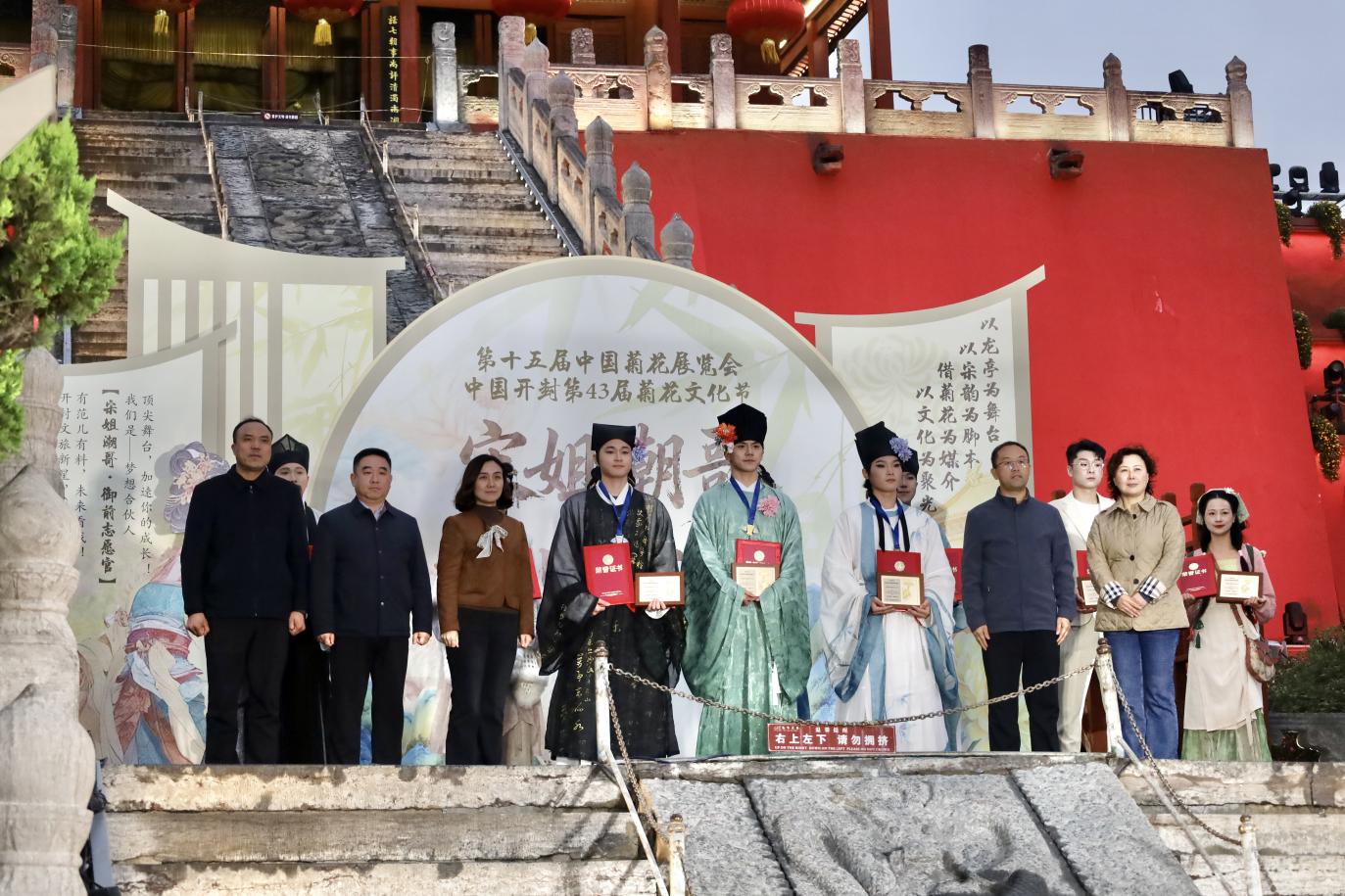 10月12日下午,第十五届中国菊花展览会、中国开封第43届菊花文化节《宋姐潮哥·菊耀龙亭》总决赛暨册封大典在开封市龙亭景区圆满落幕。本次活动由开封龙亭景区主办、河南省蝶蔓文化传媒有限公司承办,汇聚了35位优秀“御前星选官”同台竞技,我院8名学子凭借扎实素养与优异表现惊艳亮相,其中两人成功跻身前十,充分展现了文旅学子的专业风采与青春活力。